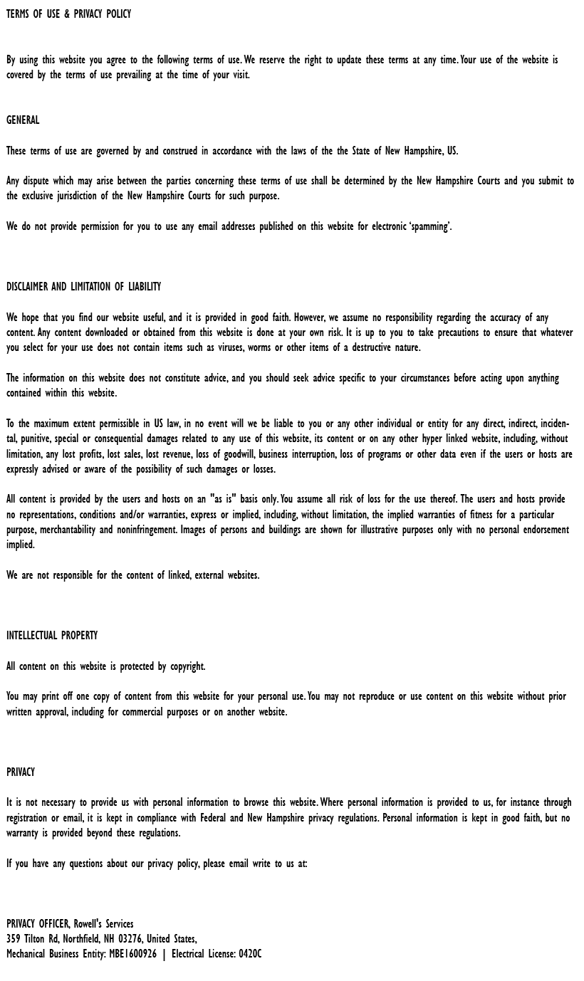 "Friendly As Can Be Since 1983!" When you need help with your plumbing, drains, heating, cooling or electrical in Henniker, you can always rely on Rowell's Services! Call us now or book online!
